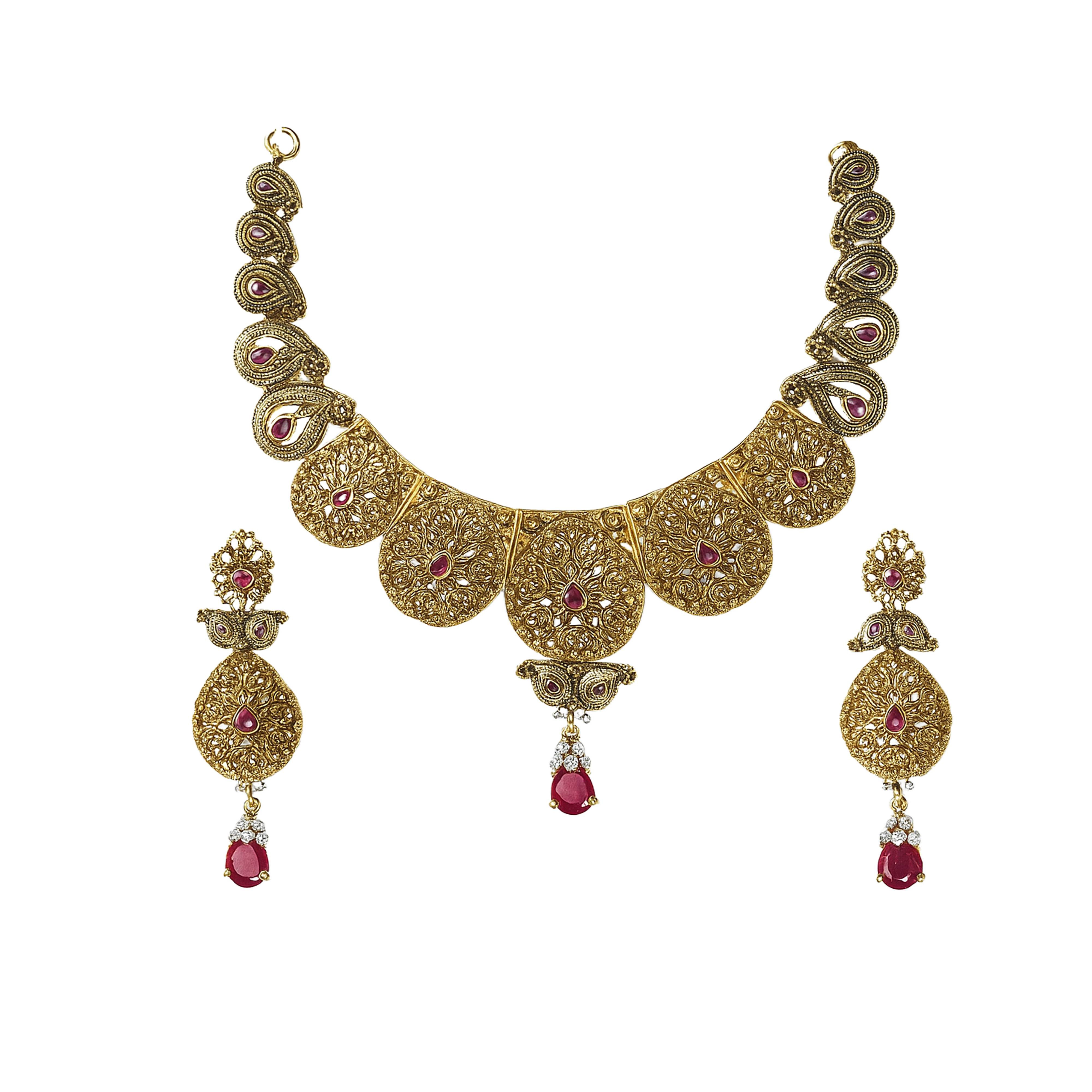 Make a statement with this antique gold-plated necklace set, featuring a beautifully detailed design with ruby drops that catch the light with every movement. The set includes a matching necklace and earrings, crafted with intricate gold filigree work and accented with sparkling stones. Perfect for weddings, festive occasions, or any special event, this set exudes elegance and traditional charm.