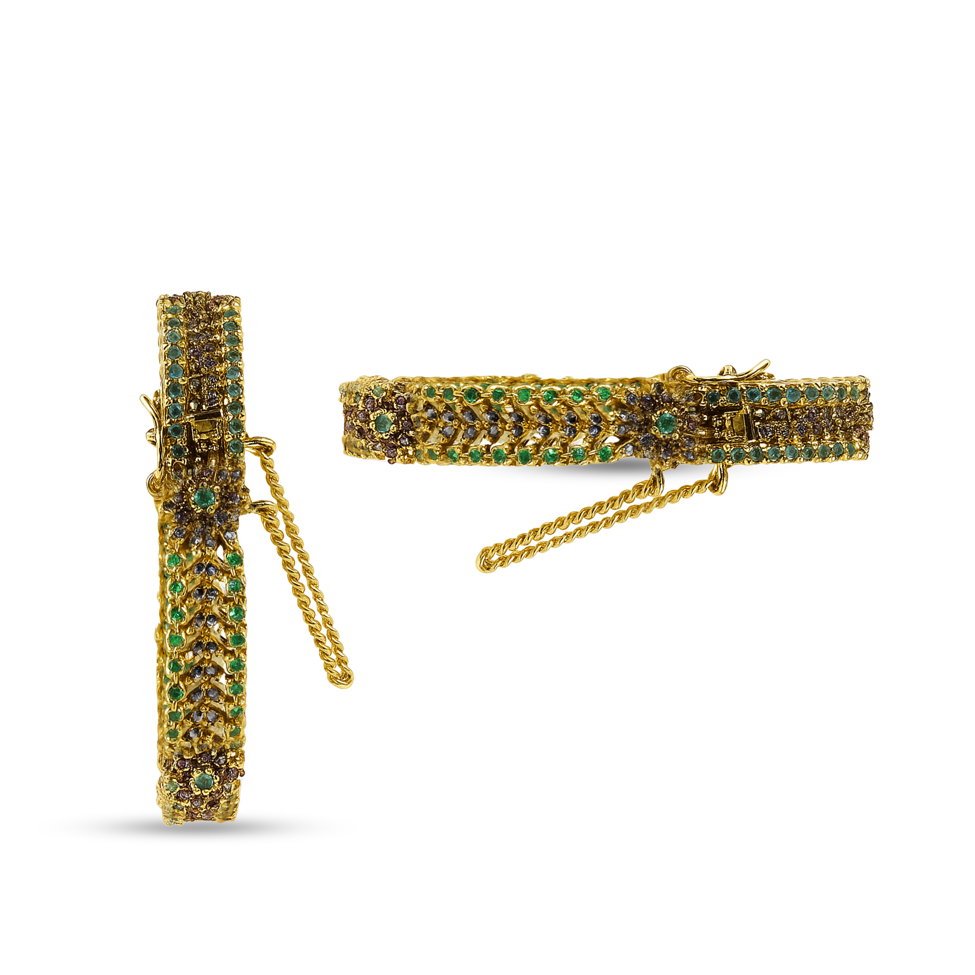 Elevate your traditional look with these stunning gold-plated bangles, adorned with green and purple stones in intricate lattice patterns. Featuring a secure clasp with safety chains, these bangles combine style with comfort, making them perfect for weddings, festive celebrations, and special occasions. The detailed craftsmanship and vibrant stones create a luxurious, eye-catching design.