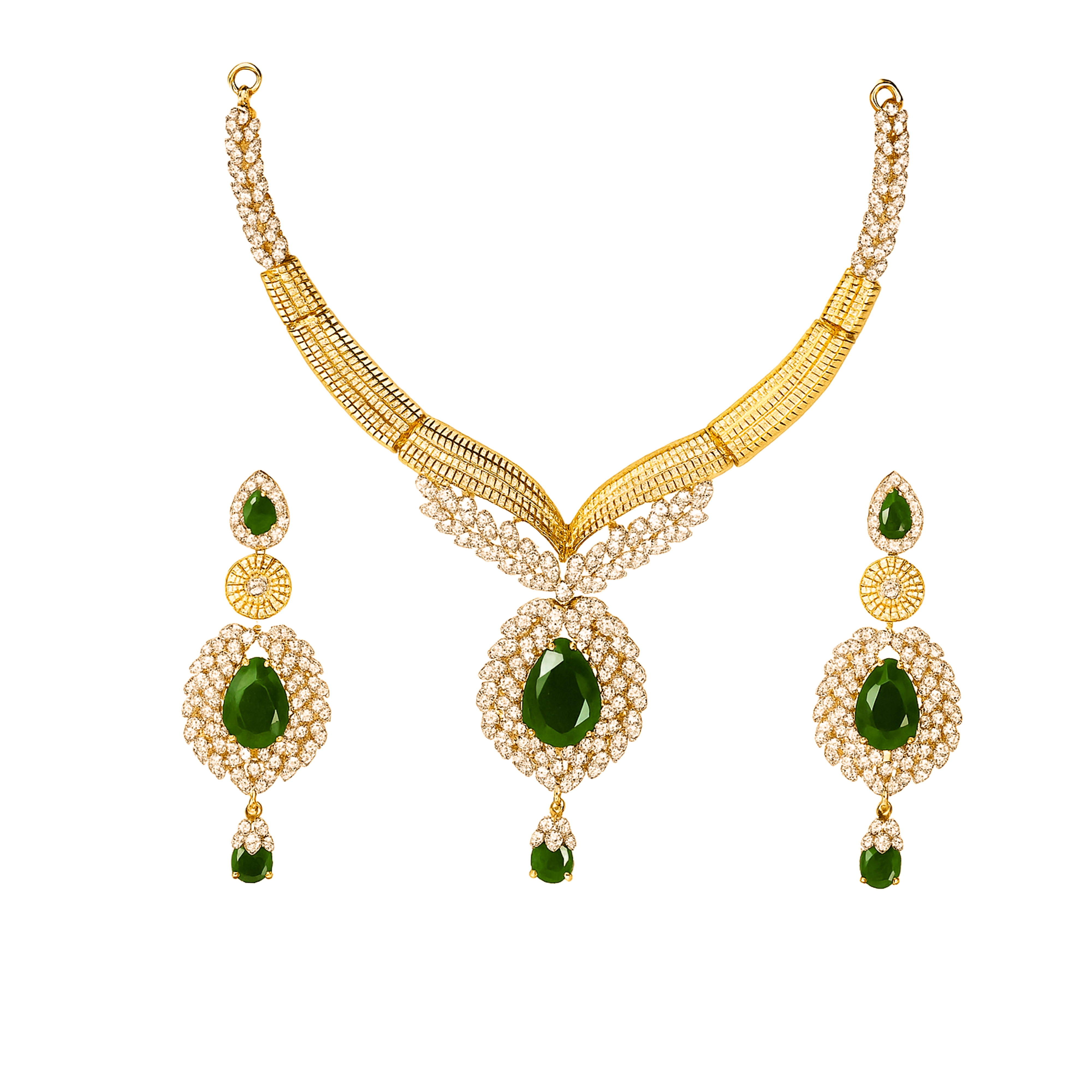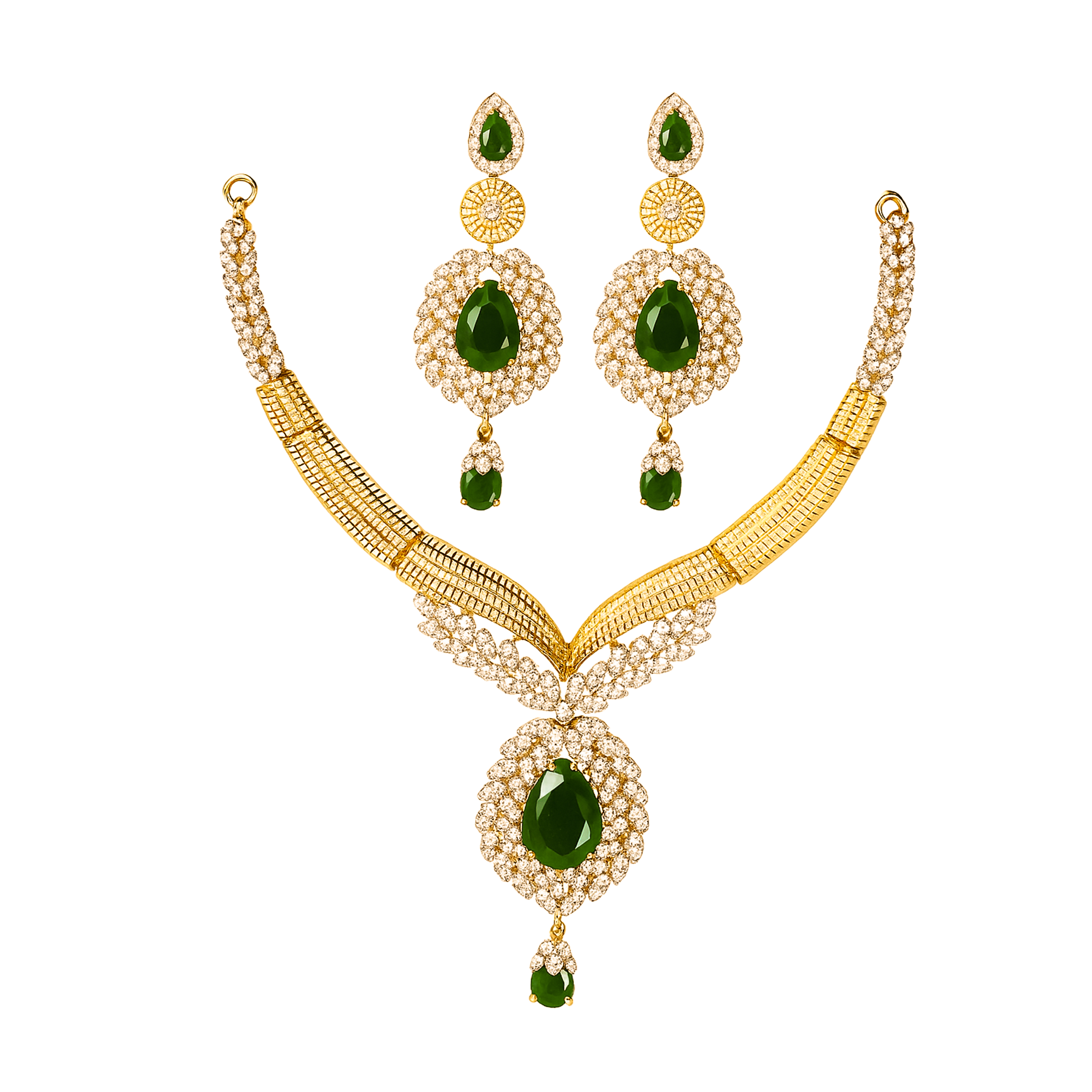 This exquisite green and gold-plated necklace set brings a regal charm to any ensemble. Featuring a finely crafted necklace adorned with sparkling green stones and intricate gold-plated floral patterns, paired with matching earrings, this set is perfect for weddings, festive occasions, or special celebrations. The carefully placed stones and meticulous craftsmanship create a timeless elegance that will elevate any outfit.