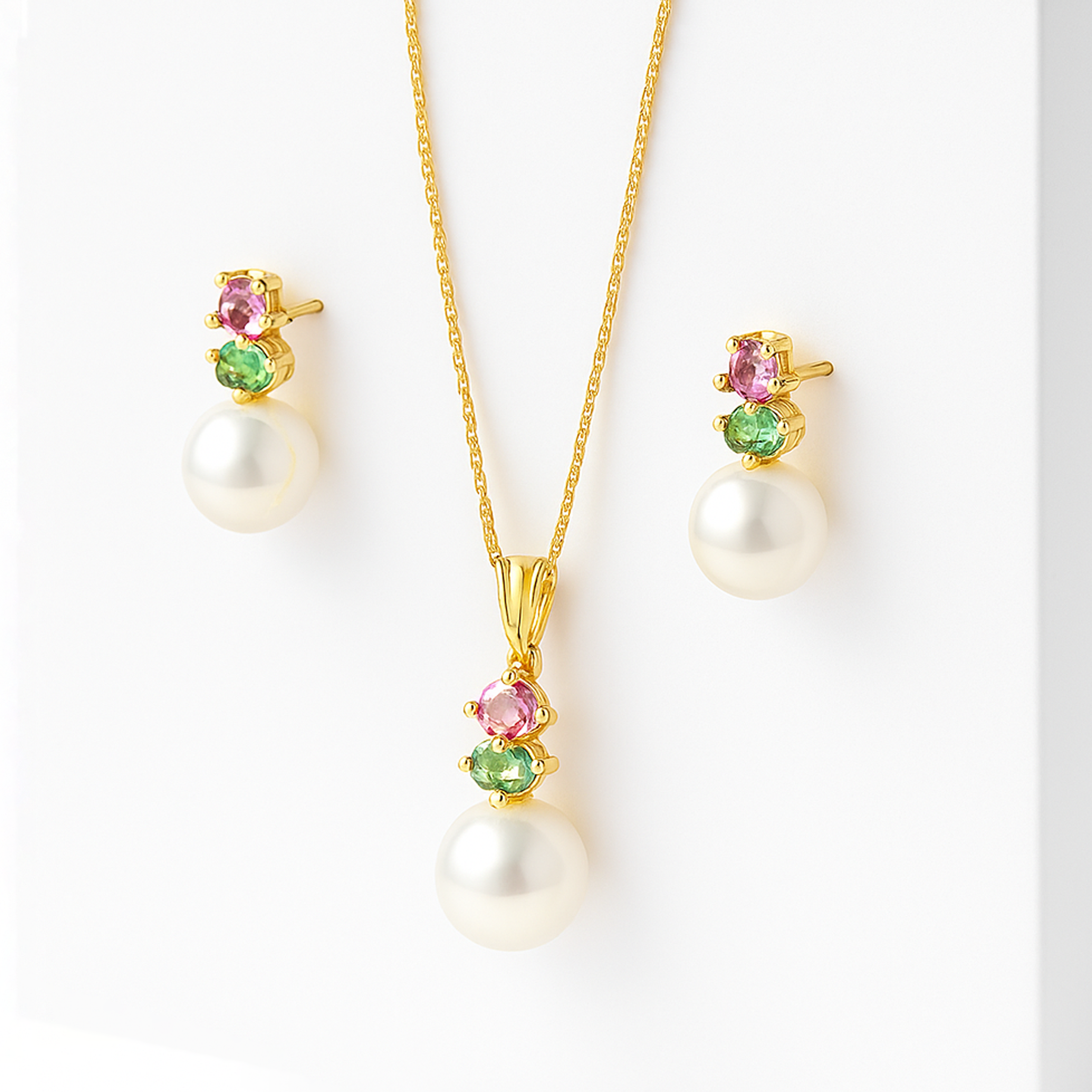 Elevate your elegance with this refined pendant and earrings set, featuring smooth, lustrous pearls complemented by sparkling ruby and emerald accents. The gold-plated 925 silver setting enhances the brilliance of the gemstones while adding a luxurious touch. Perfect for both traditional and contemporary outfits, this set brings sophistication and charm to every occasion.