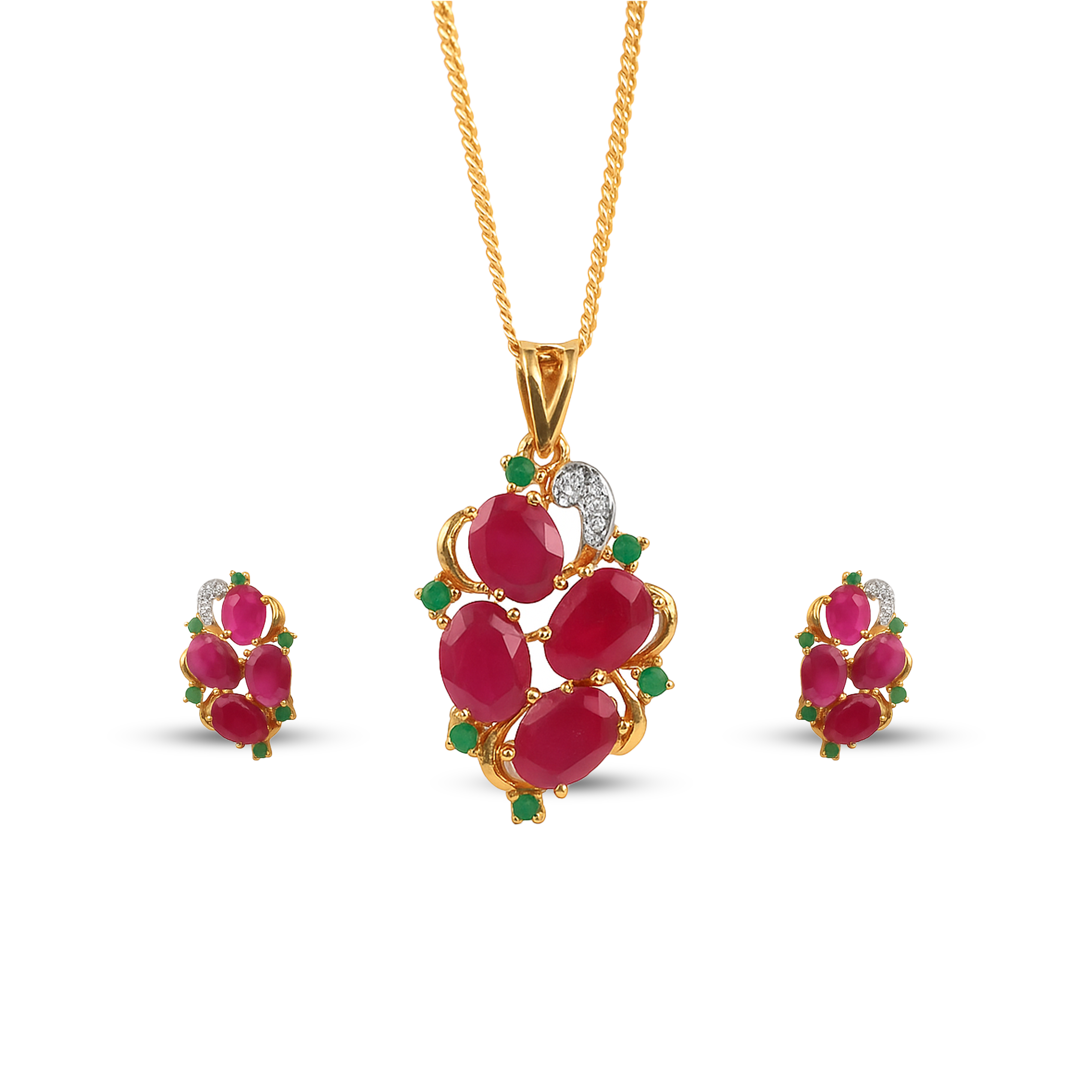 Elevate your elegance with this gold-plated pendant and earrings set featuring a stunning cluster of rich ruby stones accented with vibrant emeralds. The intricately arranged gemstones create a harmonious blend of color and sparkle, making this set perfect for festive occasions or special celebrations. Crafted in 925 silver with gold plating, it offers lasting shine and a luxurious finish.