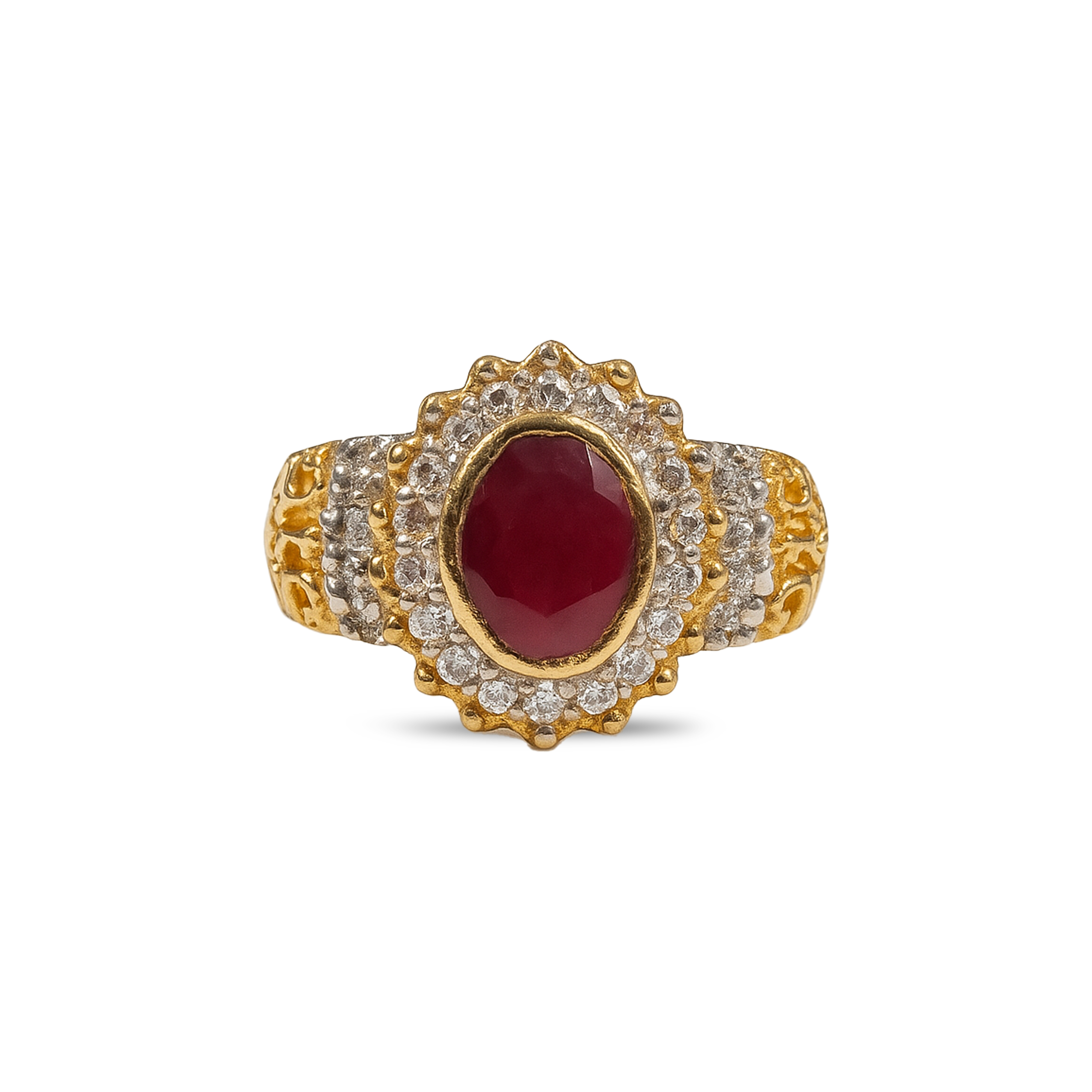 The central ruby shines in a rich, deep red hue, while the surrounding zircons accentuate the beauty of the vine design. Style this eye-catching ring solo for a subtle statement, or stack it with other bold pieces for a dazzling effect.