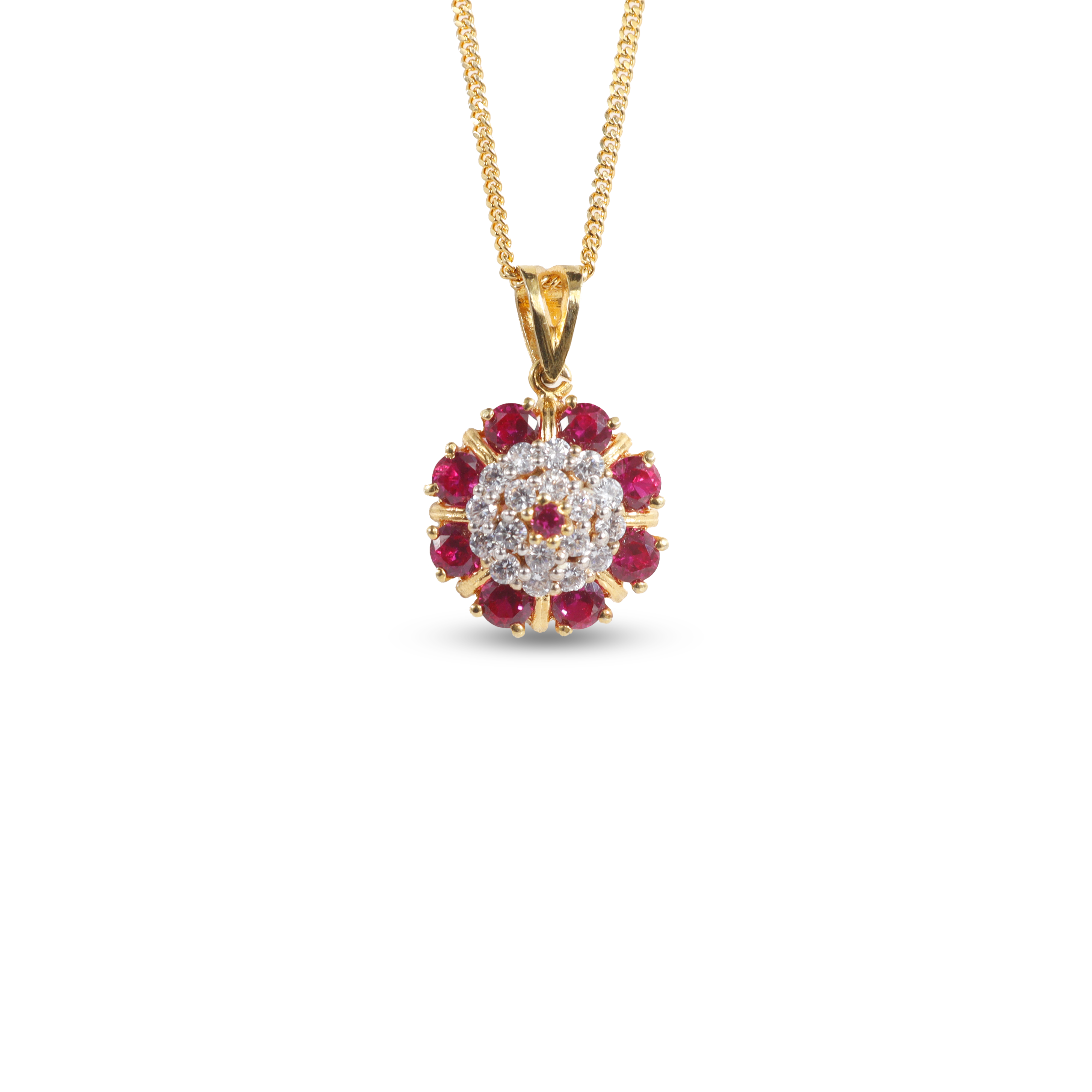 Elevate your elegance with this exquisite pendant and matching earrings set. Featuring a central cluster of vibrant rubies encircled by dazzling white stones, each piece is crafted in gold-plated 925 silver for a luxurious finish. The intricate floral design adds a touch of sophistication, perfect for festive occasions or enhancing your everyday style.