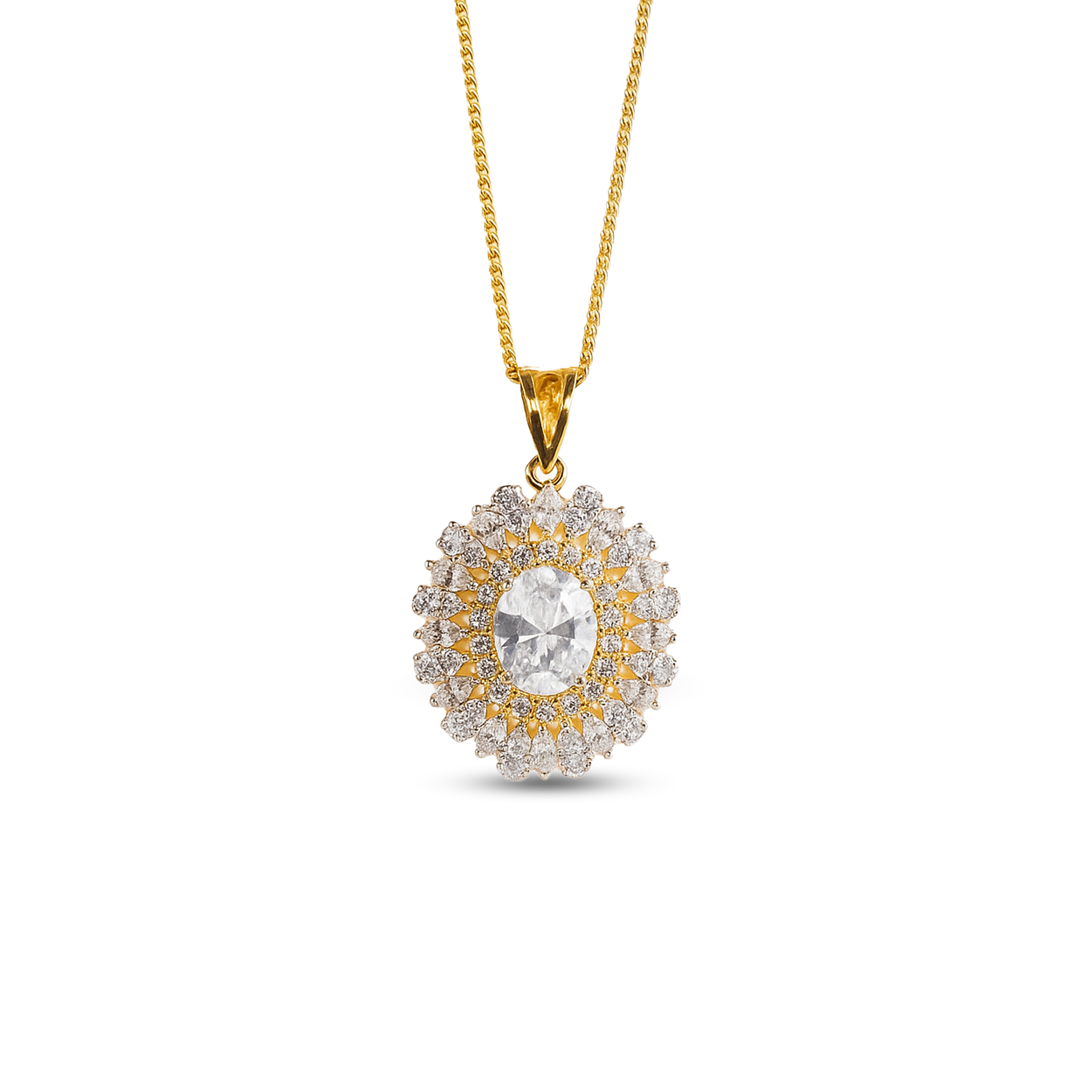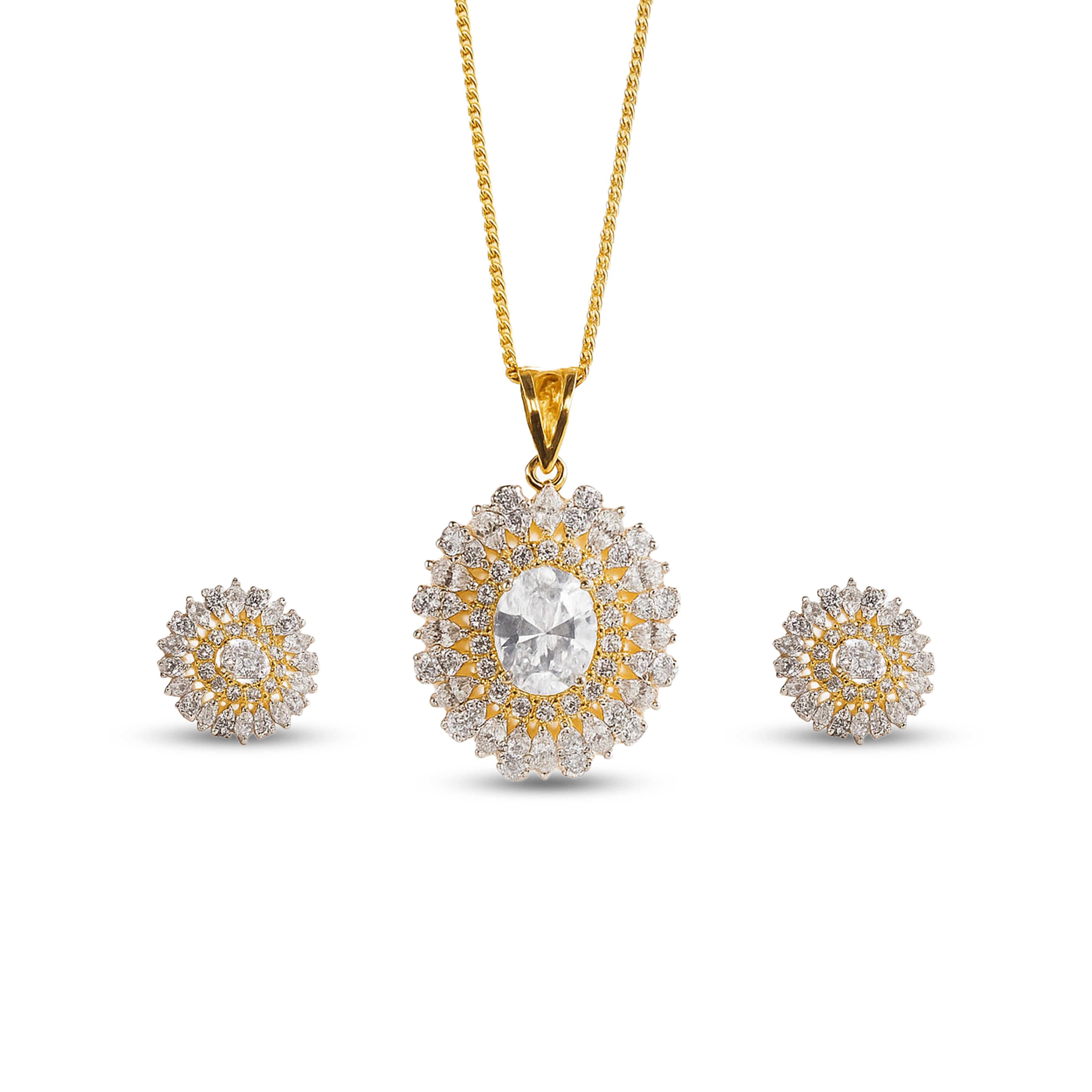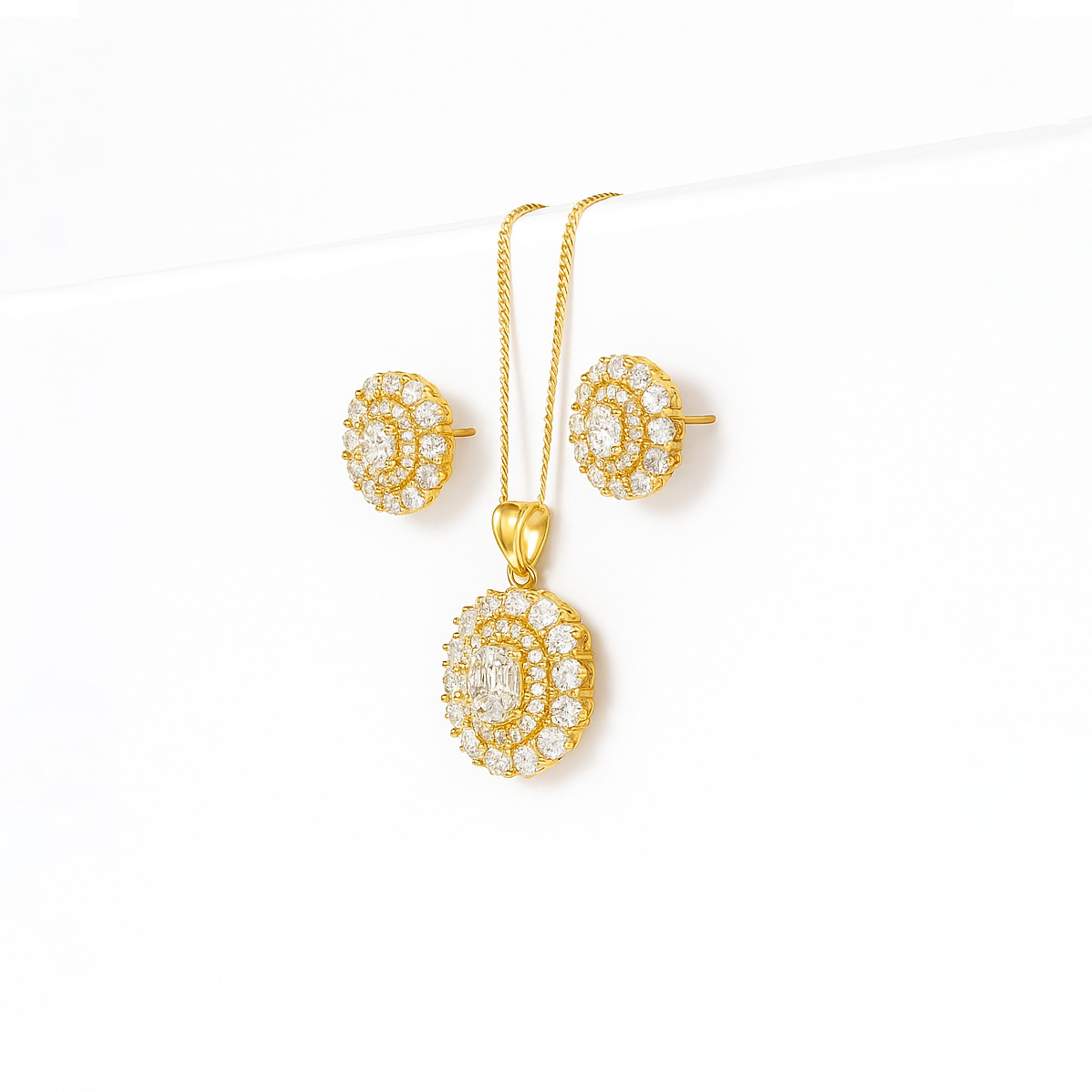 This elegant set features a matching pendant and earrings, showcasing a central white stone surrounded by an array of shimmering accent stones. The gold-plated 925 silver setting enhances the brilliance of each stone, creating a radiant, sophisticated look. Perfect for formal occasions or to add a touch of glamour to everyday wear.