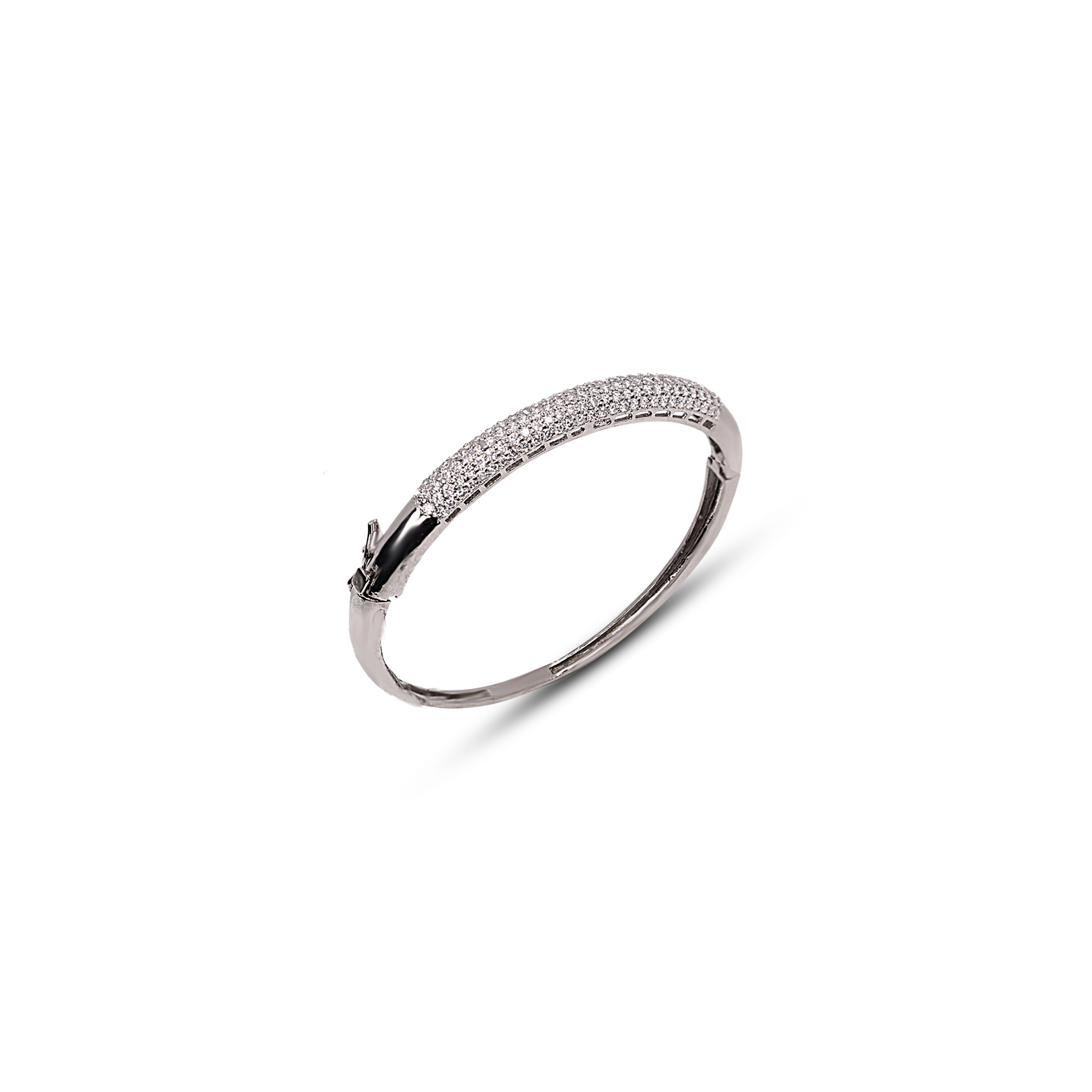 This elegant bangle features a sleek rhodium-plated band adorned with a seamless row of brilliant white zircons. The pave setting creates a smooth, continuous shimmer that adds a touch of timeless elegance to any look. Perfect for stacking or wearing alone, this bangle offers sophisticated charm, ideal for both everyday wear and special occasions. Its refined design, coupled with the sparkling white zircons, makes it a luxurious yet versatile piece for any jewelry collection.