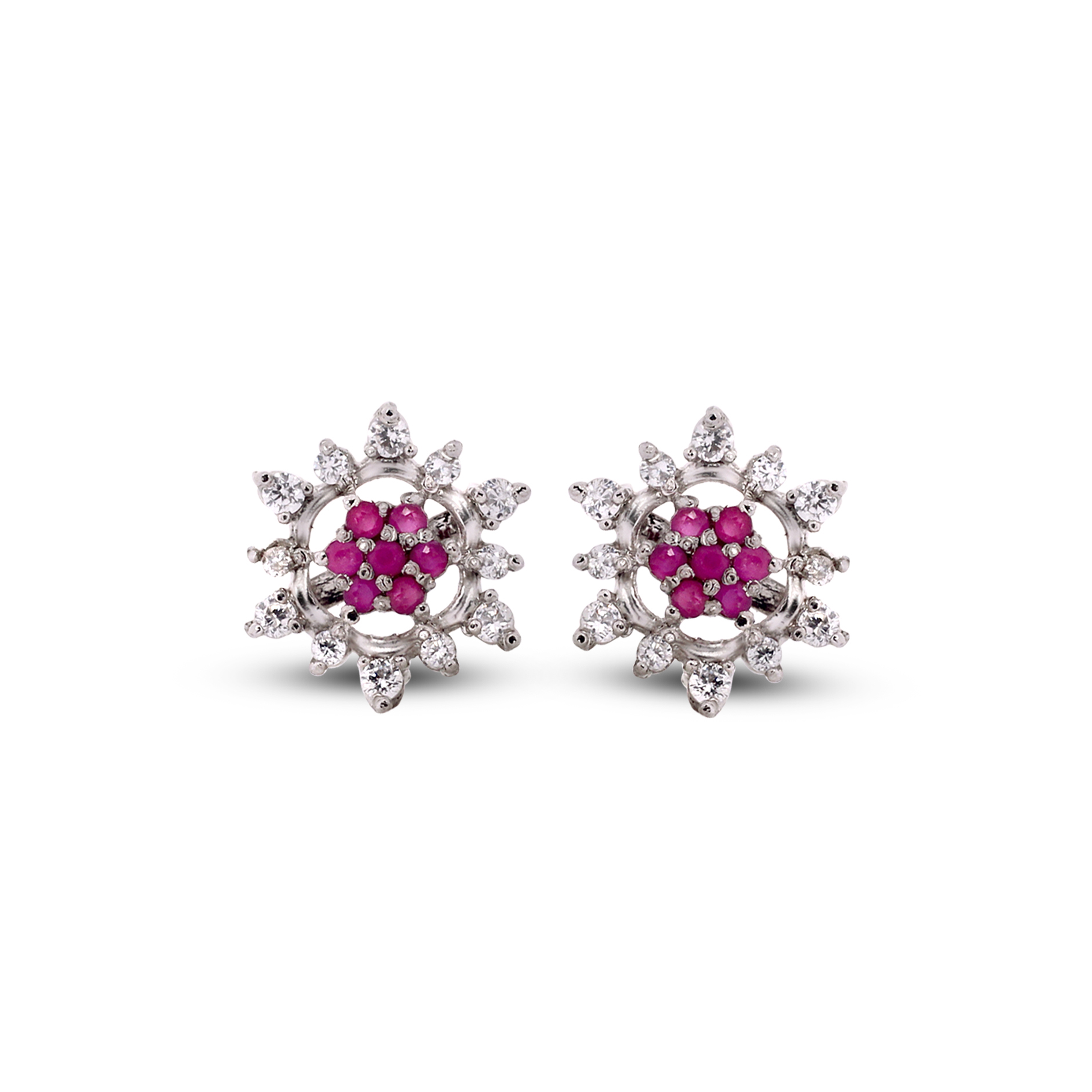 These stunning Radiant Ruby & Zircon Sunflower Earrings showcase a captivating floral design. At the center, rich red rubies create a vibrant heart, surrounded by sparkling zircon stones that form delicate petal-like rays. The contrast of the fiery rubies with the shimmering zircon gives the earrings a luxurious and radiant glow. With their intricate design and brilliant sparkle, these earrings add an elegant touch to any occasion, making them perfect for evening wear or special celebrations.