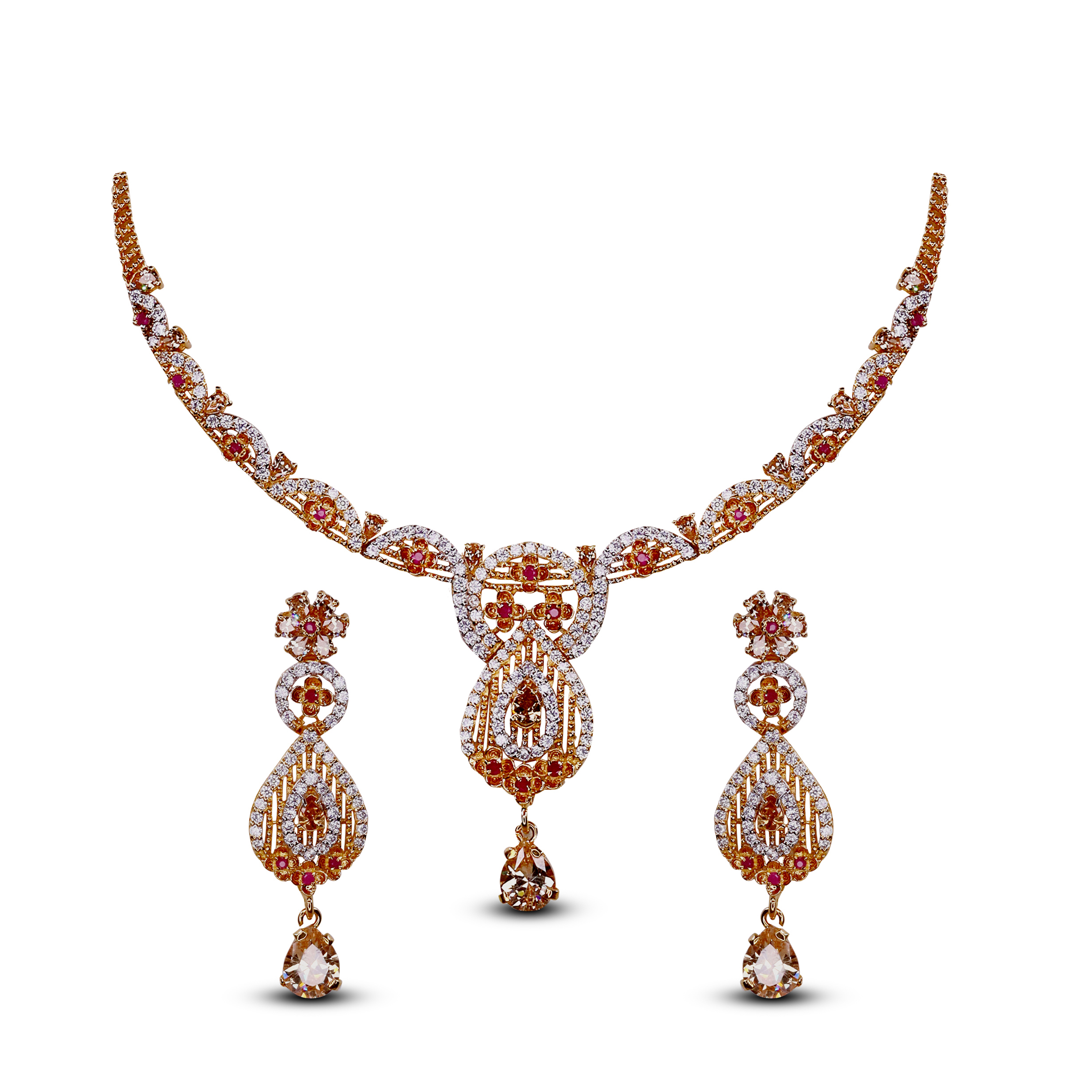 Elevate your elegance with the Regal Radiance Zircon Necklace Set, a masterpiece of craftsmanship and luxury. This exquisite set features a stunning combination of golden champagne, red, and white zircon stones, intricately set in a royal design. The necklace showcases a graceful pattern adorned with shimmering white zircons and deep red accents, creating a captivating contrast that exudes sophistication.