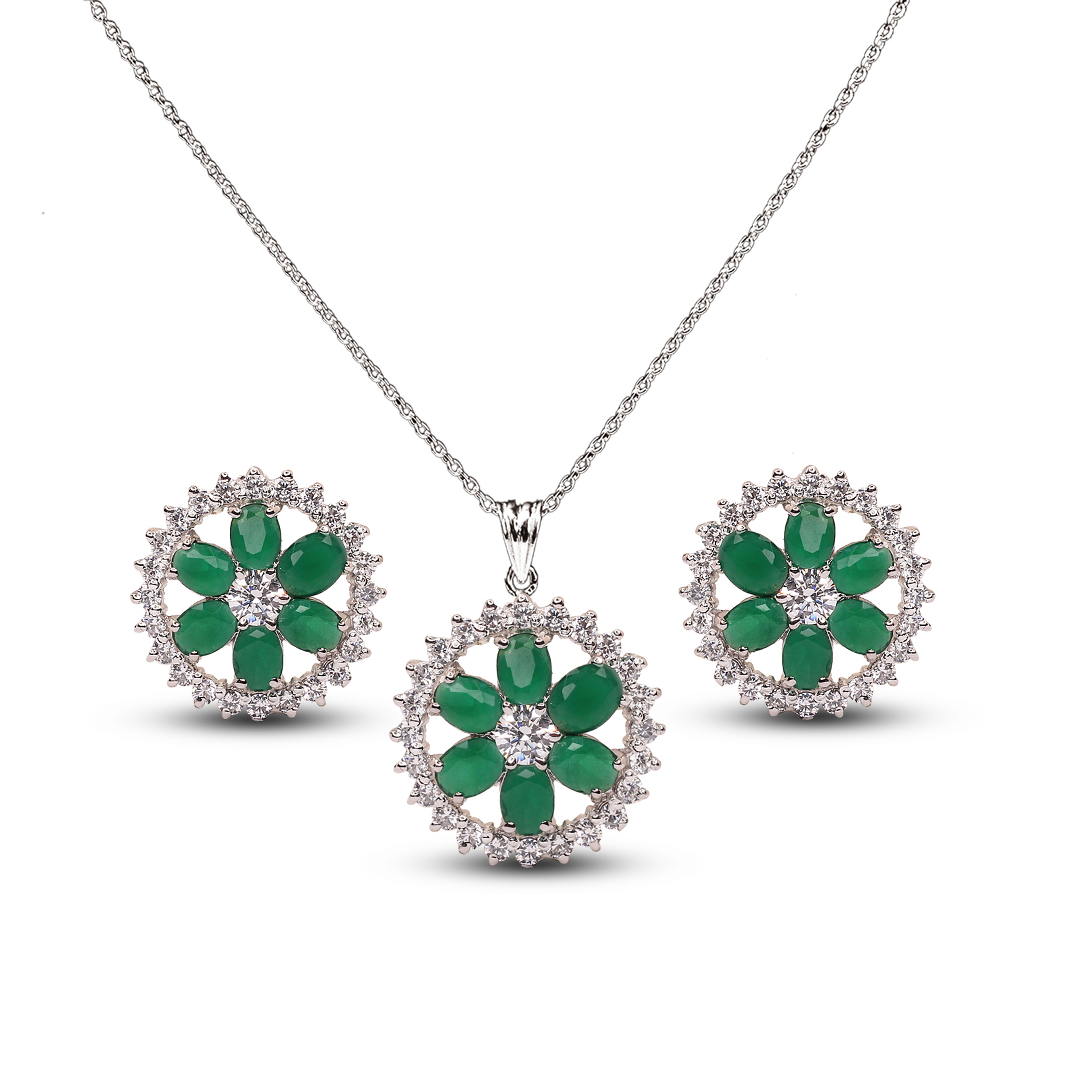 Discover the elegance of the Rhodium Emerald Flower Zircon Pendant Set, a luxurious combination of green zircon and white zircon stones, set in a delicate flower design. This beautiful set features a rhodium-plated pendant and matching earrings, each adorned with vibrant green zircon petals surrounded by sparkling white zircons, creating a stunning contrast that radiates sophistication.