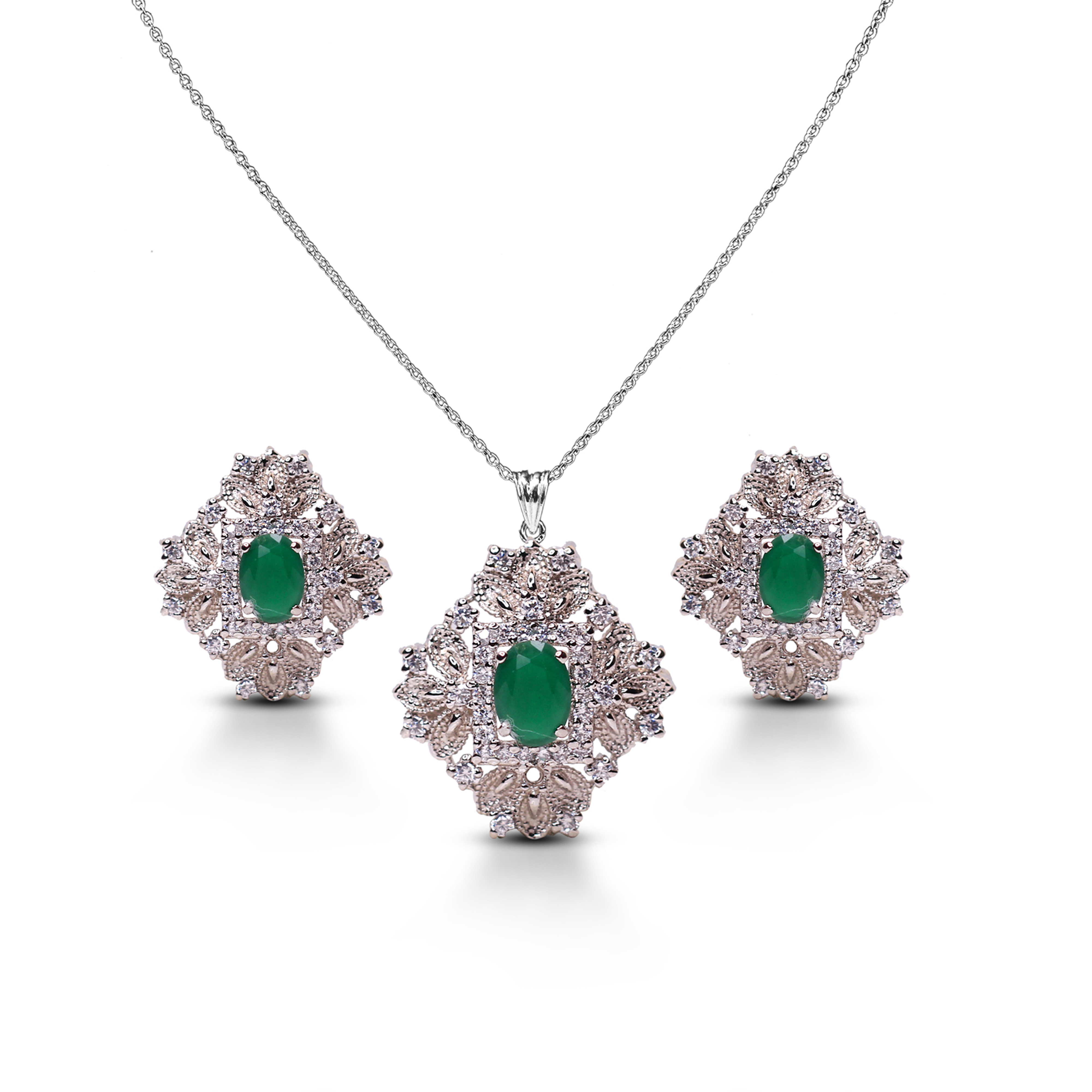 Embrace timeless elegance with the Rhodium Emerald Zircon Pendant Set, a masterpiece of sophistication and color. Featuring green zircon stones at the center, surrounded by a delicate arrangement of white zircons, this set is crafted with a sleek rhodium-plated finish that enhances the natural beauty of the gemstones.