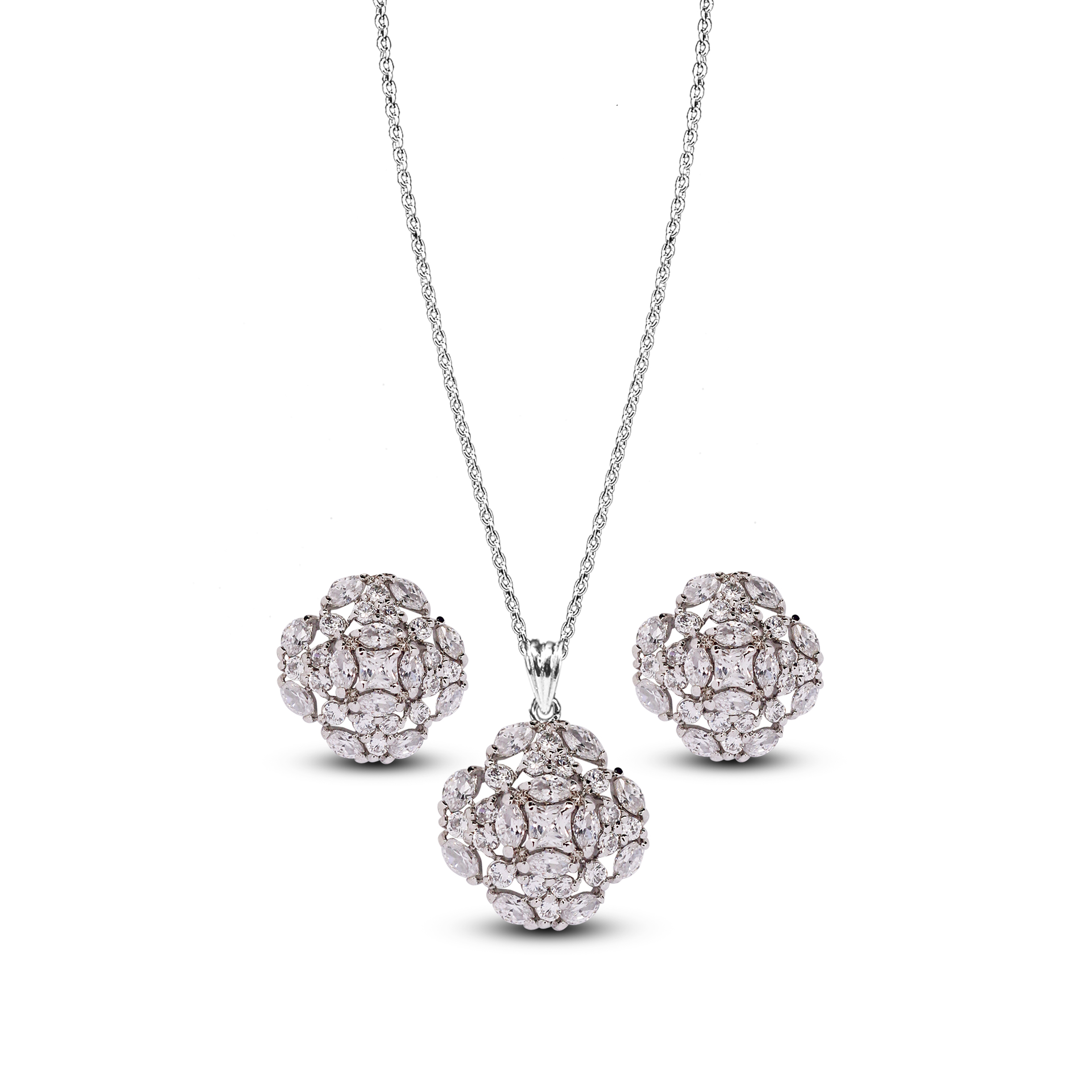 Exude sophistication with the Rhodium Radiance White Zircon Pendant Set, a luxurious jewelry ensemble that perfectly balances glamour and elegance. This set features a rhodium-plated chain and matching earrings, each adorned with sparkling white zircon stones intricately arranged in a lavish floral cluster design.