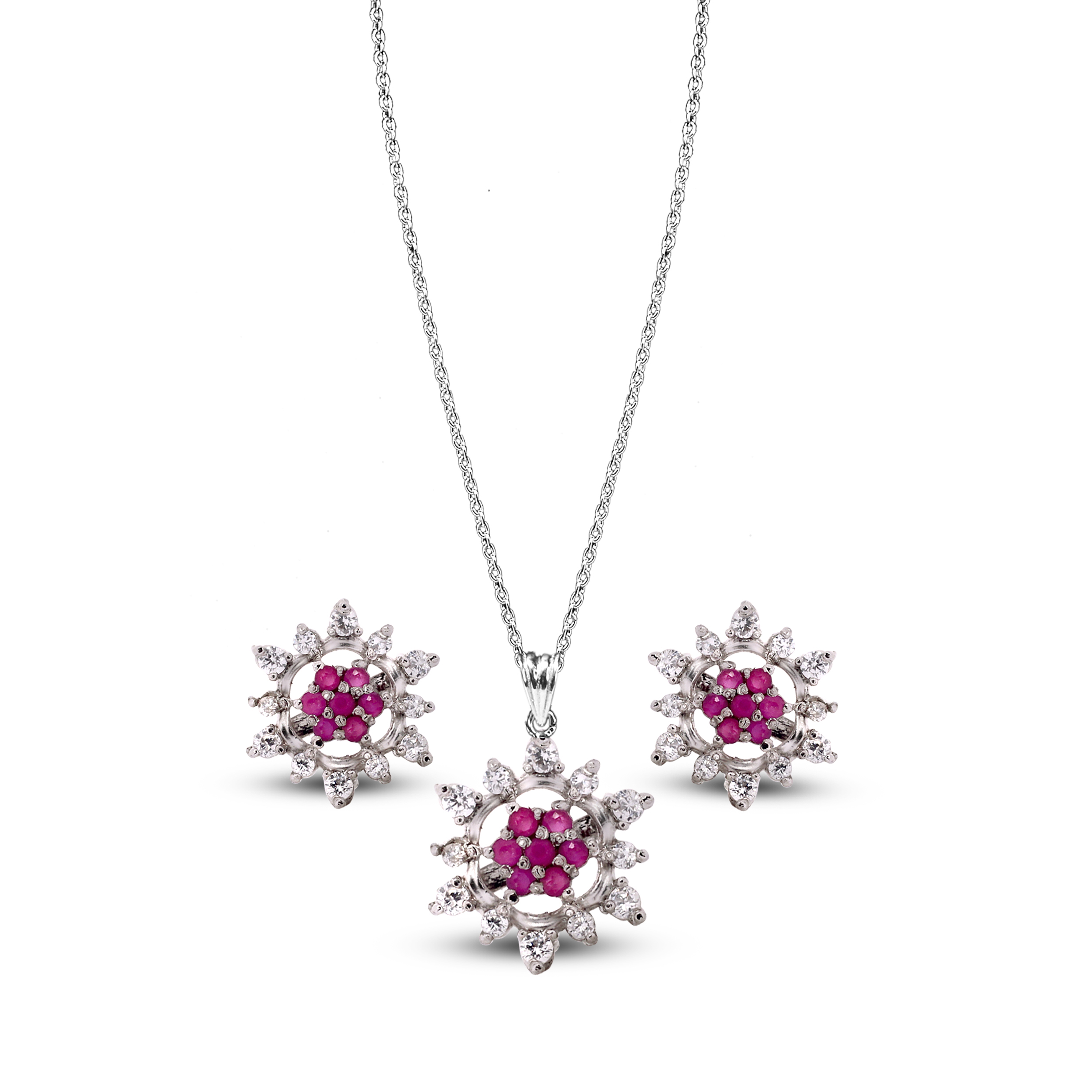 The Rhodium Rose Zircon Pendant Set is a stunning combination of vibrant red zircons and sparkling white zircons. This set features a beautifully designed pendant and matching earrings in a rhodium-plated setting, with each piece designed in a floral motif. The centerpiece of each item is a cluster of red zircons, surrounded by white zircon accents that enhance the design's brilliance and elegance.